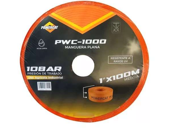 La manguera plana POWERCAT PC-PWC-1000 de 1″ está fabricada en lona resistente y soporta hasta 10 bar de presión. Viene en rollo de 100 m, ideal para uso agrícola, industrial y conducción de agua limpia.
