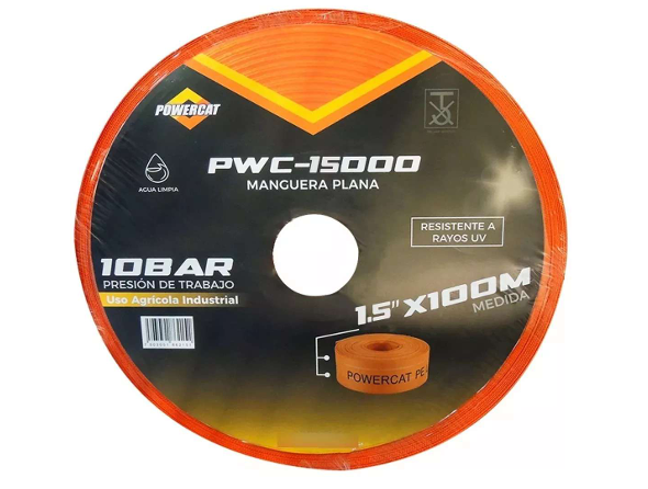 La manguera plana POWERCAT PC-PWC-15000 de 1.5″ está fabricada en lona de alta resistencia y soporta hasta 10 bar de presión. Se presenta en rollo de 100 m, adecuada para aplicaciones agrícolas, industriales y conducción de agua limpia.