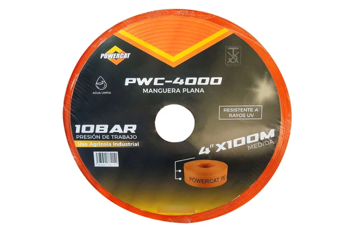 La manguera plana POWERCAT PC-PWC-4000 de 4″ ofrece una resistencia de 10 bar y se presenta en rollo de 100 m. Ideal para usos agrícolas, industriales y para conducción de agua limpia con alto caudal.